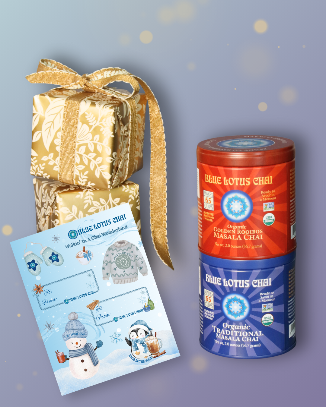 Order by December 16 for Christmas delivery, and we’ll include our limited-edition Blue Lotus Chai Wonderland Sticker Sheet with every purchase. Two gift labels included for easy, festive gifting!